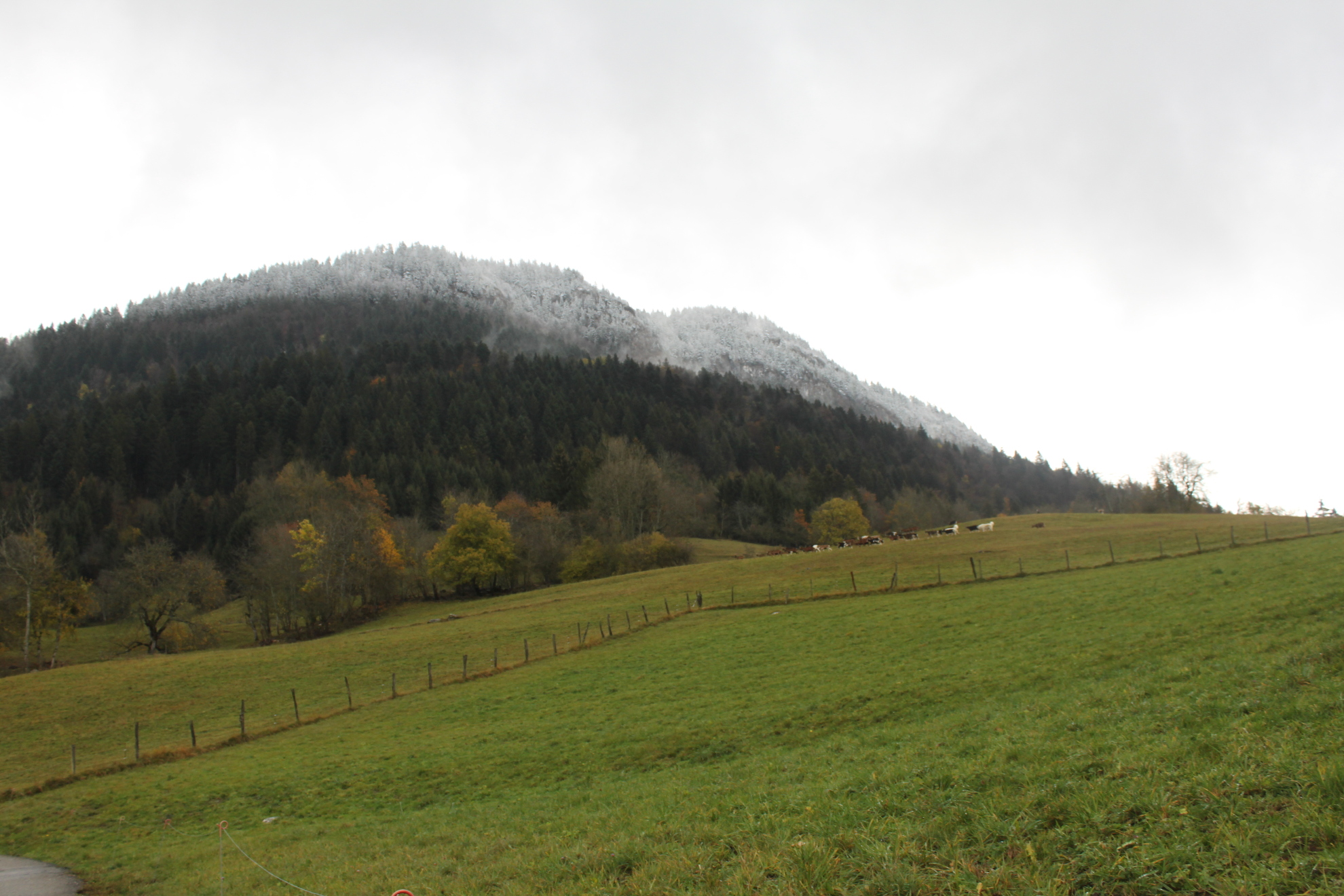 Le Mont Chabert, point culminant de la Motte en Bauges, recouvert d’une fine couche de neige. Dans le pré en dessous, les chèvres et les 2 patous que nous avions déjà rencontré dans leur alpage de cet été.